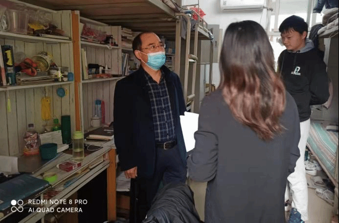 刘寒冰每进入一间宿舍,都会深入细致地检查用电安全及卫生情况,并与学生亲切的交谈,详细了解学生们的思想动态及生活状况,认真听取了学生们对宿舍和生活服务设施的意见,并对学生宿舍环境卫生、宿舍文化建设、宿舍学风建设进行了现场指导。他嘱咐同学们一定要严格遵守学校宿舍管理相关规定,不使用违规电器,尤其是在夏天来临之际要更加注意用电安全,保证人走电断。同时,他建议学生一定要提高宿舍公共卫生和个人卫生水平,要多锻炼、勤洗手、常通风,扎实做好卫生防疫工作。