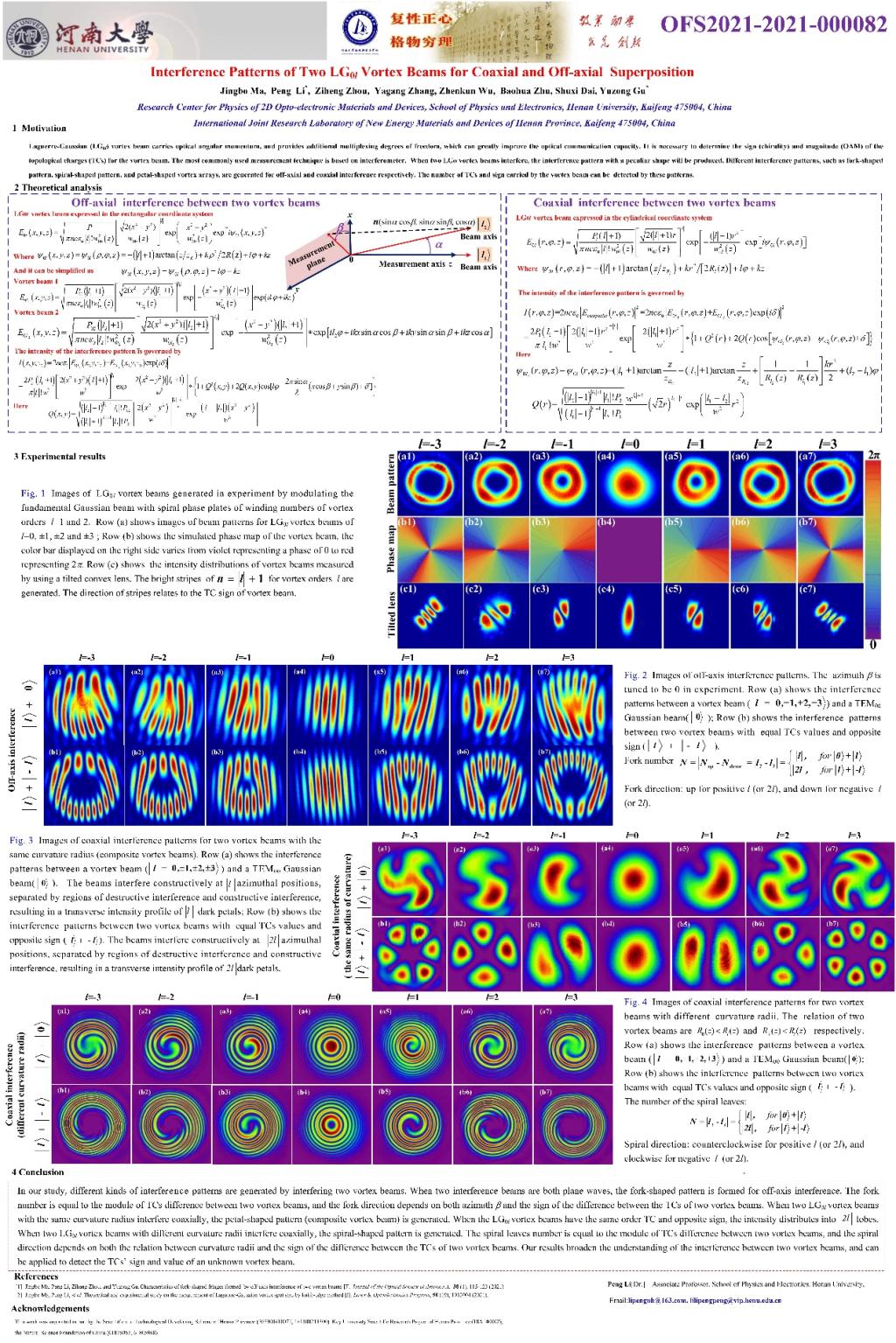 硕士生马靖博获奖的张贴报告论文在实验上系统研究了两束LG0l涡旋光的干涉特性,详细阐释了干涉图样与两束涡旋光的拓扑荷的符号和大小、空间位置关系(方位角)等之间的关系。该研究工作为涡旋光束的检测、手性微结构材料的加工和微粒的俘获与操控等方面的研究提供了重要指导。研究内容及实验结果得到大会组委会的一致认可。