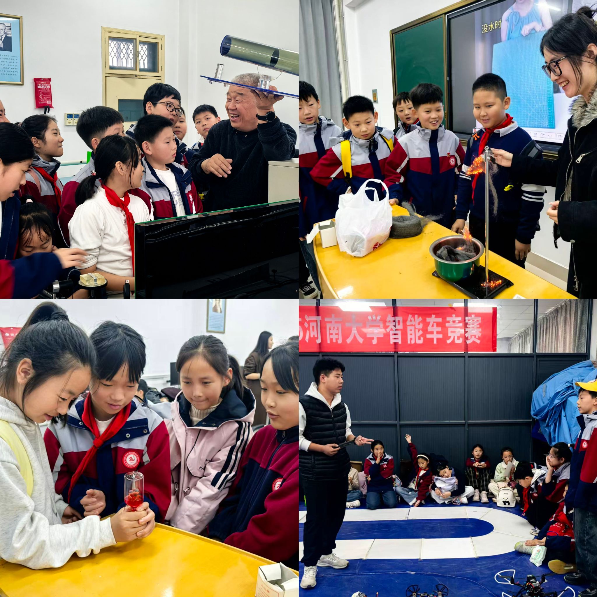 作为河南省首批中小学实验室开放试点单位,星火馆依托物理与电子国家级实验教学示范中心,通过科普馆、趣味物理实验、创新创业实验室三大特色板块,为龙飞小学的师生们呈现了一场融合知识性、趣味性与创新性的科学盛宴。未来,学院将持续推进中小学科普基地建设,通过定期举办公众开放日、科普讲座等系列活动,充分发挥高校资源的科普教育功能,助力青少年科学素养提升,为实现科技强国的教育愿景贡献力量。随后,学生们参观了创新创业实验室内汽车竞赛的优秀作品,包括智能循迹小车、自动避障机器人等获奖作品。大学生团队现场讲解并演示了这些作品的创新功能,让学生们直观感受到物理知识在科技创新中的实际应用。并且在现场还设置了知识抢答环节,答对的同学获得“特别的尺子”作为奖励,进一步提升了学生的参与感与成就感。