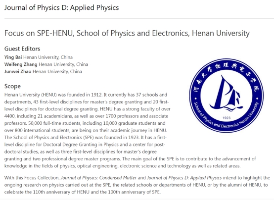 在《Journal of Physics D-Applied Physics,》(JPD)和《Journal of Physics-Condensed Matter》(JPCM)期刊分别组织了校庆学术专刊。经过一年多的准备,近日JPD已成功在线出版校庆专刊,JPCM也已在线刊出部分专刊论文。