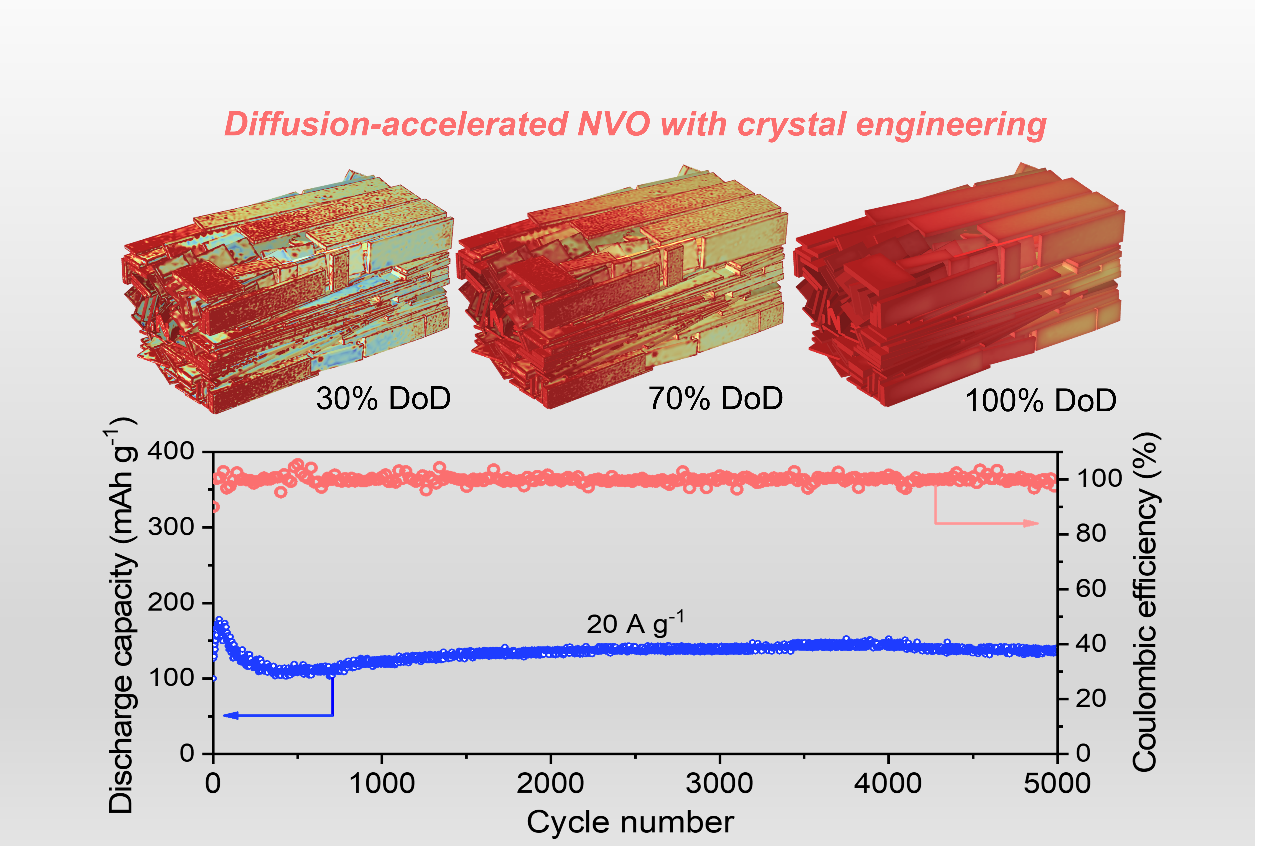 水系锌离子电池钒基正极材料由于高的比容量而备受关注。然而,在循环过程中,由于由于锌离子与在嵌入钒基正极材料时会存在较强的静电作用力导致副反应的发生进而引发材料退化从而导致倍率性能下降。近日,白莹教授团队在理论预测的指导下,利用晶体工程成功地设计了择优取向的Na2V6O16·3H2O(NVO)正极材料。根据理论计算预测出锌离子在NVO正极材料中可能存在不同的扩散路径,发现直线隧道路径其离子迁移能垒较低。并且利用多物理场模拟方法,得到在锌离子嵌入过程中,活性面强度最高的NVO内部锌离子浓度场分布较为均匀的结果。从电化学分析中表明,NVO作为水系锌离子正极材料具有良好的电化学性能,特别是在较高的电流密度20 A g-1下,其容量为156.9 mAh g-1,同时具有良好的长期循环能力(5000次循环后容量为140.6 mAh g-1,容量保持率为78.5%),此外在300 mA g-1较小电流密度下循环300周仍然保持了较高的循环保持率,说明NVO正极材料在弱酸性电解液中的溶解性问题得到了有效的改善。本工作所揭示的晶体工程可作为从根本上提高正极材料电化学性能的有效策略,并有望运用到可用于锂、钠、钾等二次可充电电池体系。